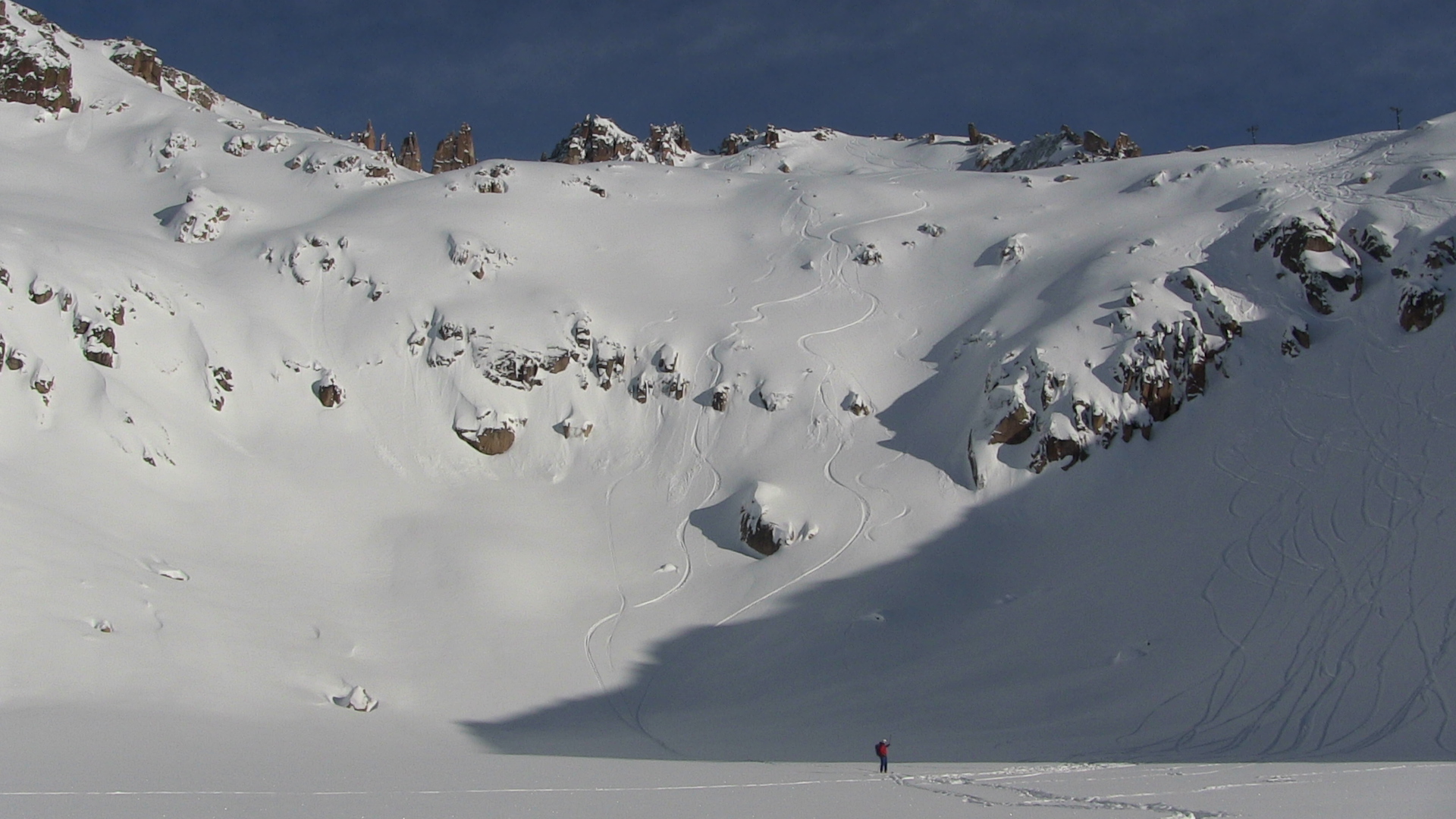 August 20th:  August 20th wasn’t bad either with blue skies, perfect, re-crystalized snow with sparkly hoar frost on everything.  That day were were able to get into the backcountry of La Laguna and Van Titter and it was all time.