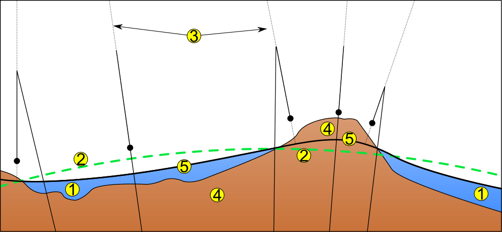 Explanation of the geoid: 1) ocean 2) ellipsoid (sea level averaged out) 3) local plumb line (pull of gravity) 4) continent 5) geoid (+/- gravity due to differences in ocean height). source: wikipedia