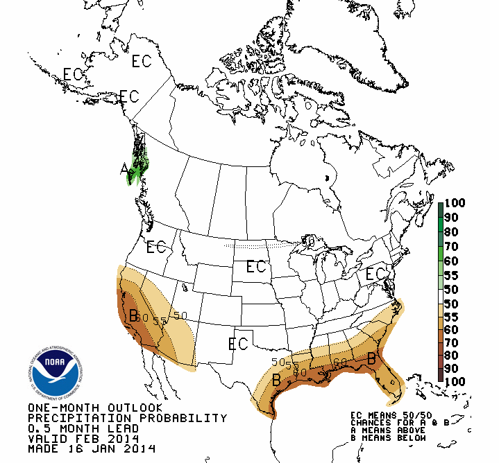 Precipitation wise, below average precipitation is forecasted for CA, NV, AZ and the American South in February.