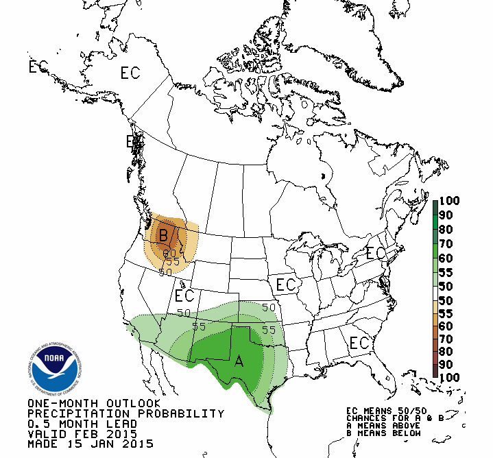 NOAA recently released their outlook forecast for February 2015 in the USA.  This February outlook continues to favor an El Nino pattern despite El Nino having never shown up this winter.  NOAA is now only giving El Nino a 50-50 chance of showing up, which is the same as saying “I have absolutely no idea.”